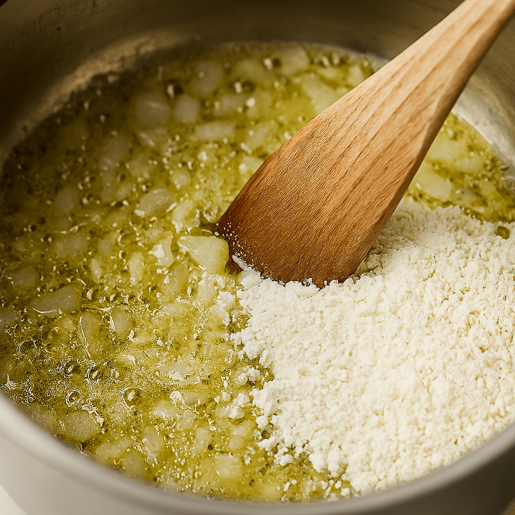 ◦ Stir in flour and cook for 1–2 minutes.