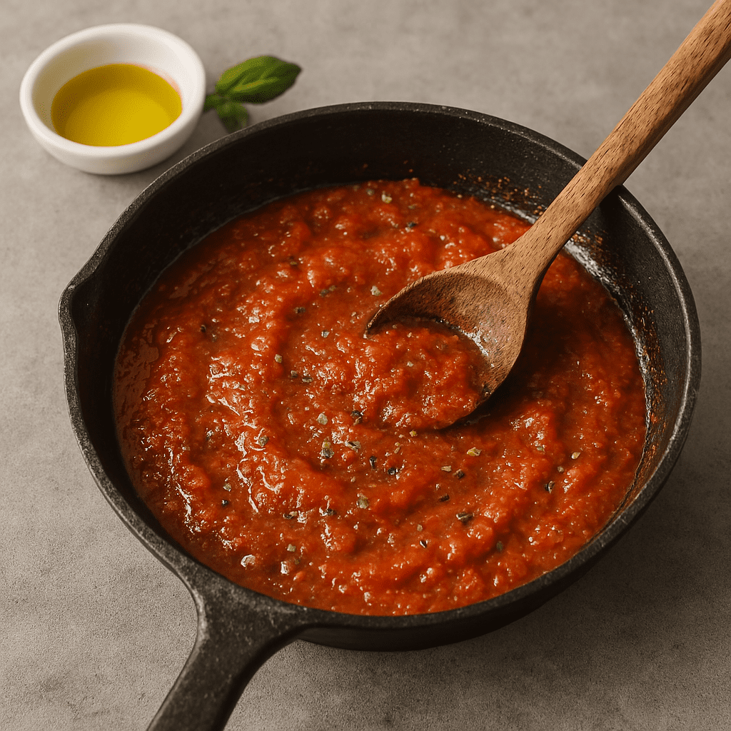 ○ In a small pan, heat a splash of olive oil. Sauté garlic briefly, then add crushed tomatoes and oregano. Simmer for 10–15 minutes until slightly thickened. Season to taste.