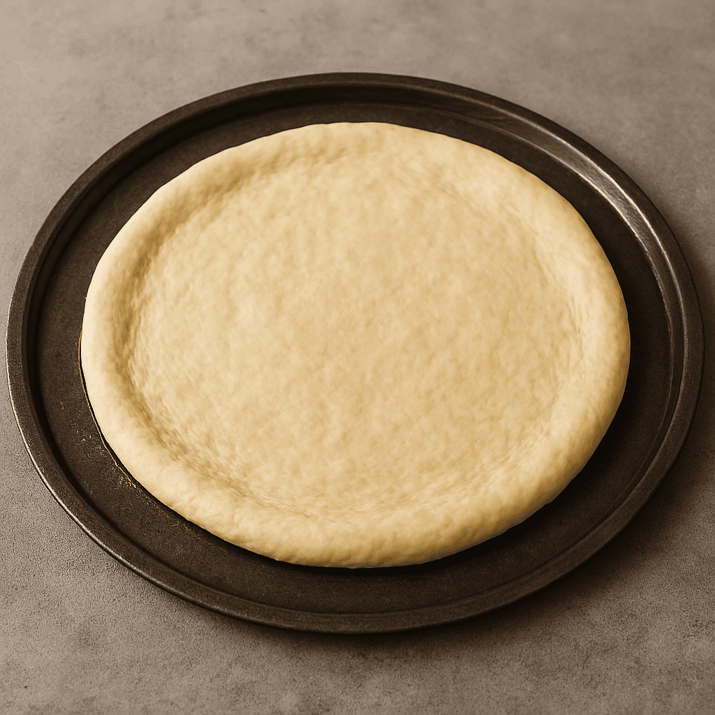 ○ Preheat oven to 220°C (425°F). Punch down the dough and roll into a 10–12 inch circle. Transfer to a lightly oiled baking tray or pizza stone.