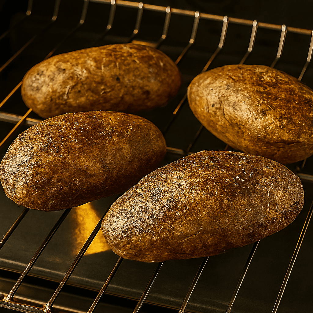 Preheat oven to 200°C (400°F). Scrub potatoes, prick with a fork, rub with olive oil and salt. Bake directly on the rack for 45–50 minutes until fork-tender.