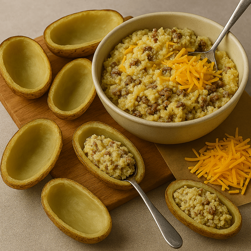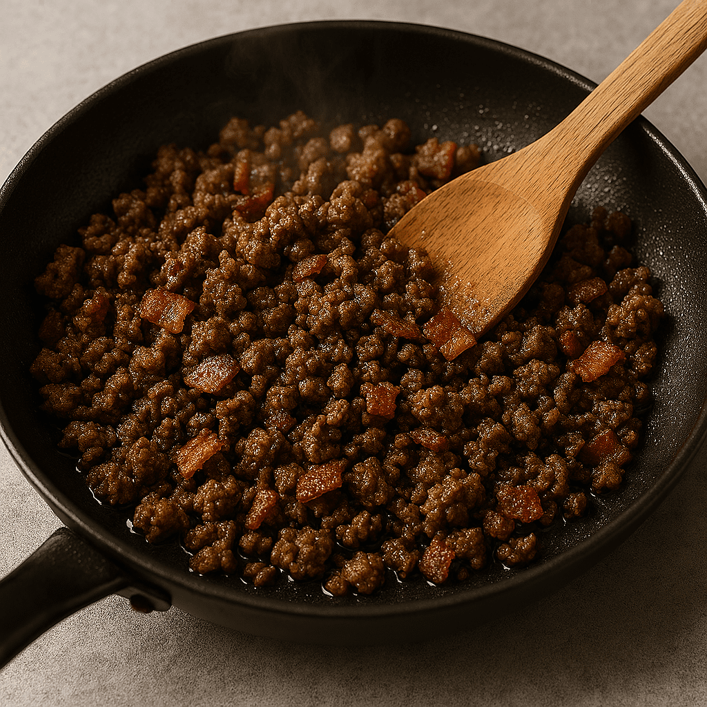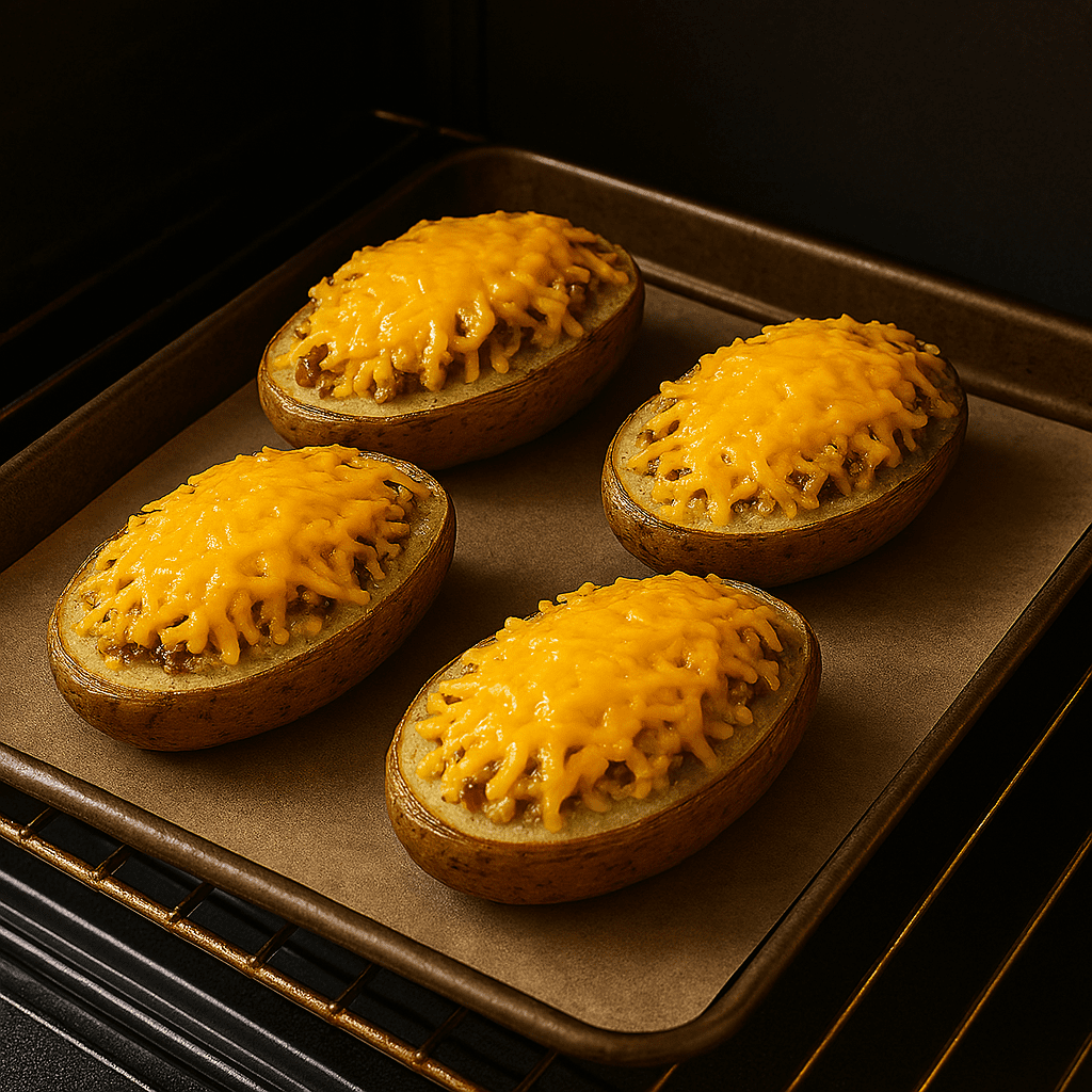 While potatoes bake, cook ground beef in a skillet over medium heat until browned. Add diced bacon or sausage and cook for another 2–3 minutes. Set aside.