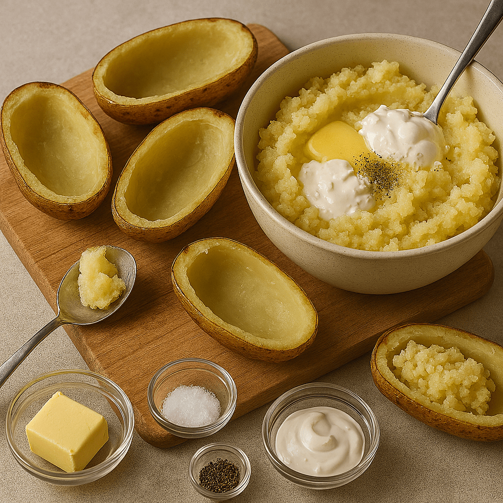 Once potatoes are cool enough to handle, slice in half lengthwise. Scoop out the flesh, leaving a thin shell. Mash the flesh with butter, sour cream, milk, salt, and pepper.