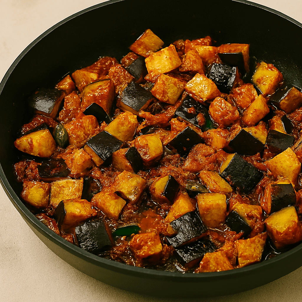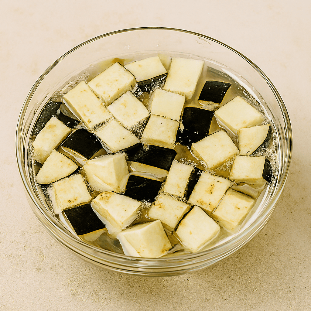 ◦ Soak cubed eggplant in salted water for 10 minutes to reduce bitterness. Drain and pat dry.