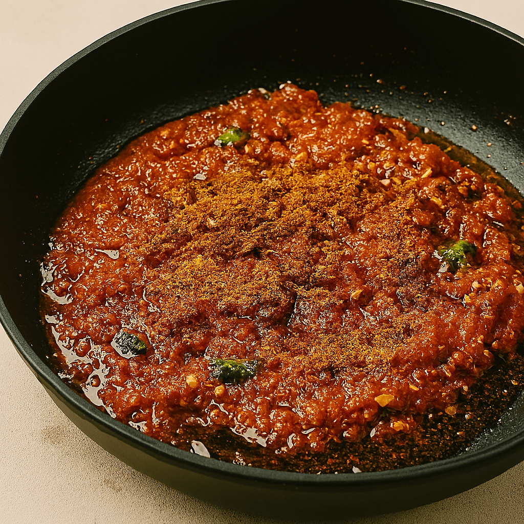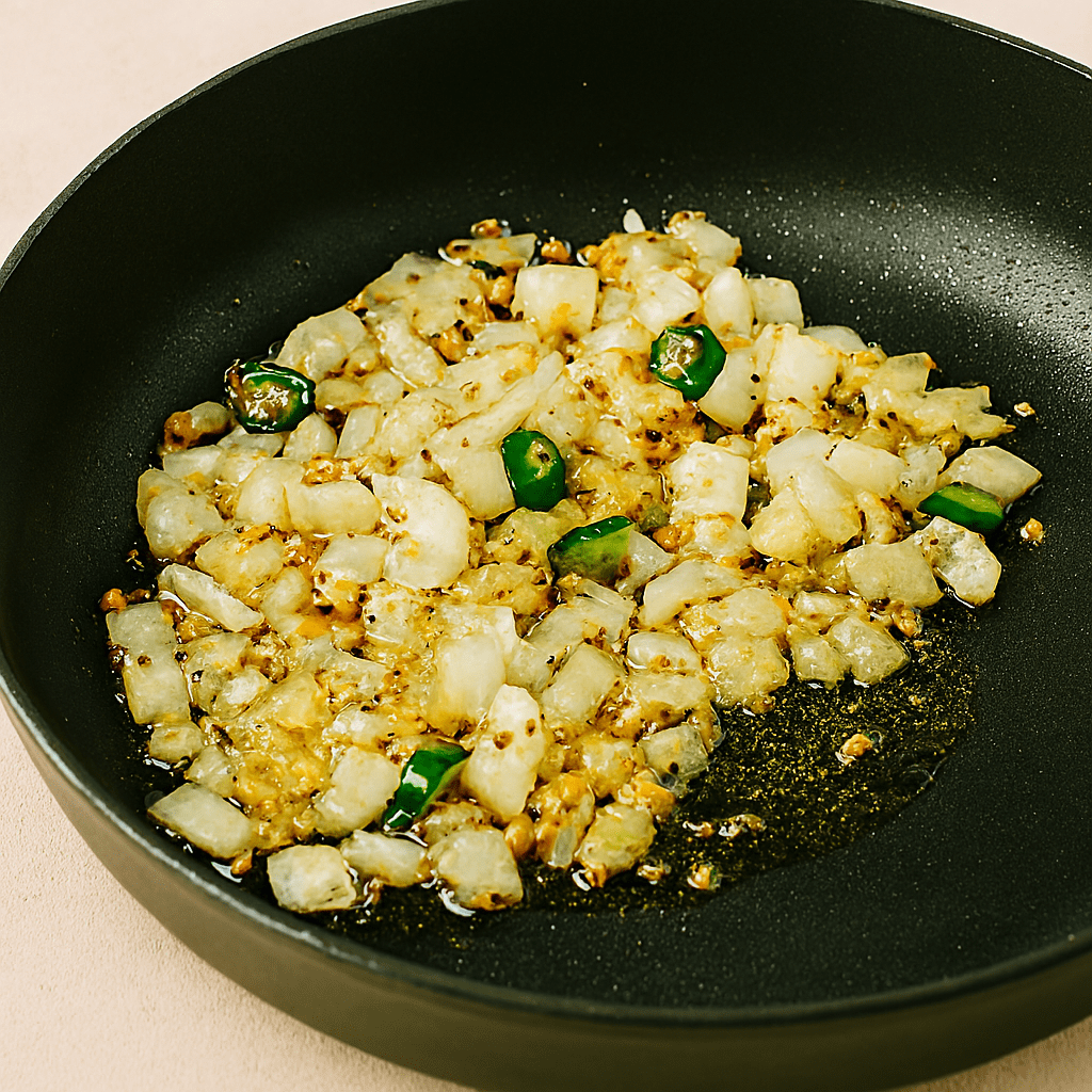 ◦ Add onion, garlic, ginger, and green chilies. Sauté until golden.