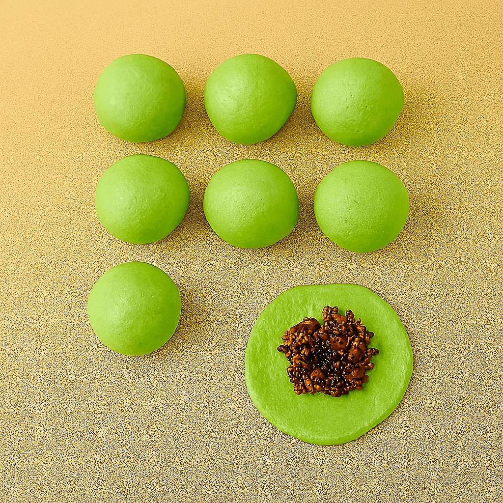 ◦ Flatten each ball, place a bit of chopped gula melaka in the center, and seal tightly.