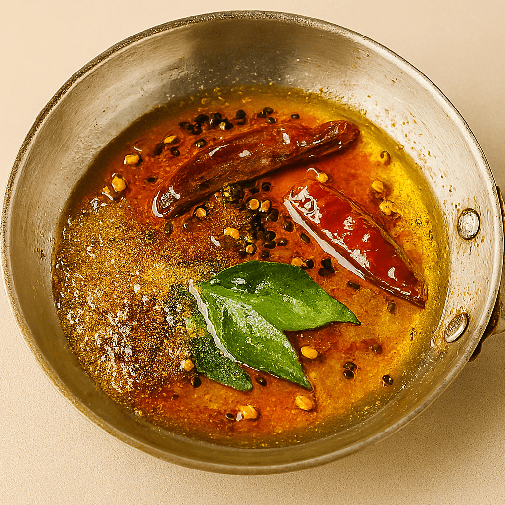 ◦ Heat oil/ghee, add mustard seeds, fenugreek, red chilies, hing, and curry leaves.