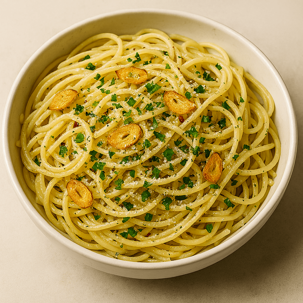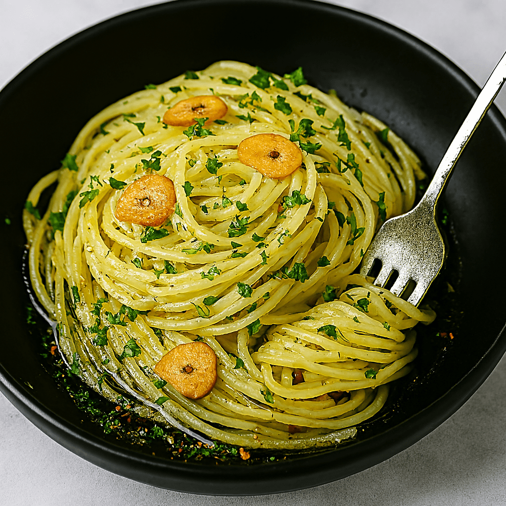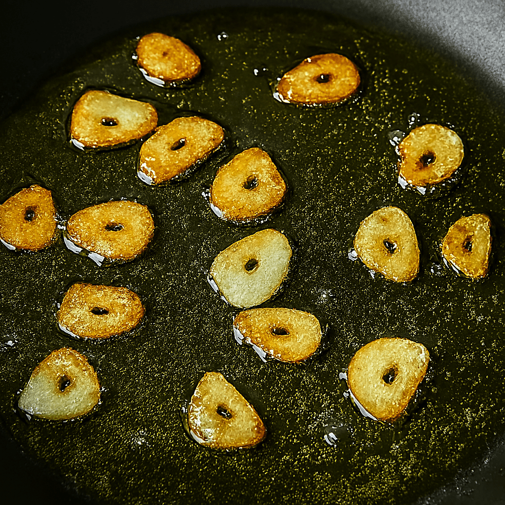 ◦ Add sliced garlic and sauté until golden and crisp. Remove and set aside for garnish.