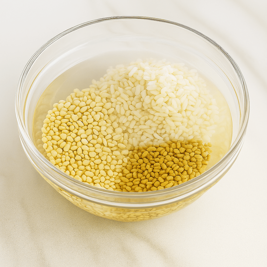 • Rinse rice, urad dal, and fenugreek seeds.