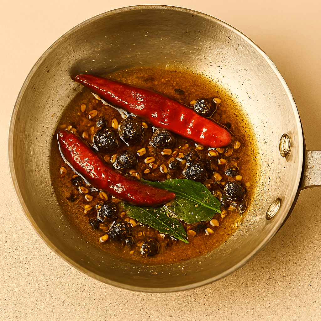 ◦ Add fenugreek, red chilies, hing, curry leaves, and sundakkai. Sauté until golden.