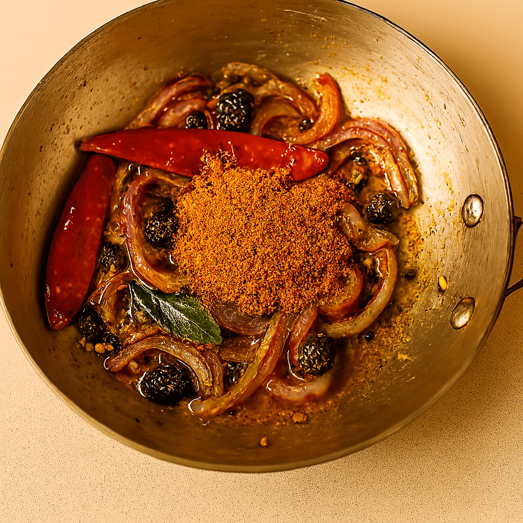 ◦ Add sambar powder and sauté for 30 seconds to release aroma.