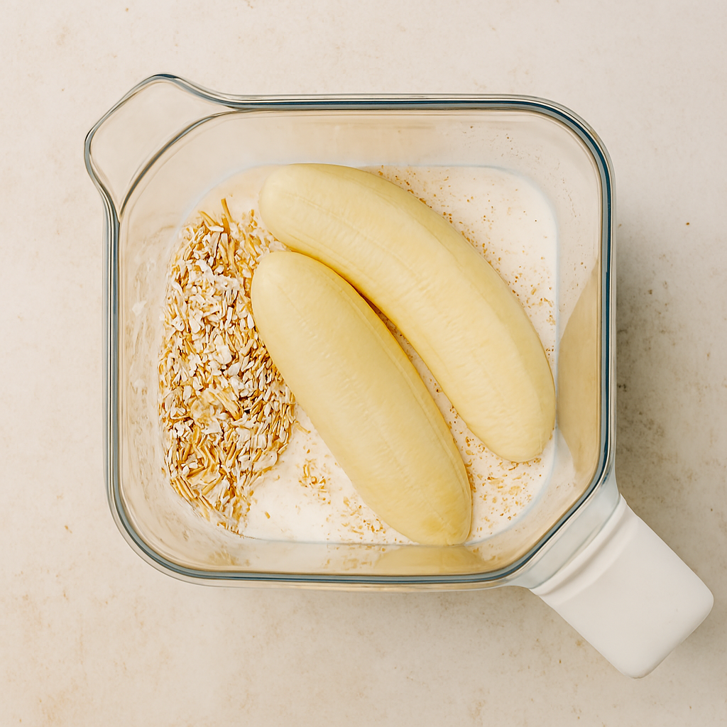 â—¦ Add bananas, oats, milk, eggs, baking powder, cinnamon, and salt to a blender. Â