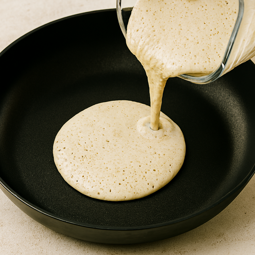 â—¦ Pour ¼ cup batter per pancake; cook until bubbles form and edges set (2–3 mins). Â