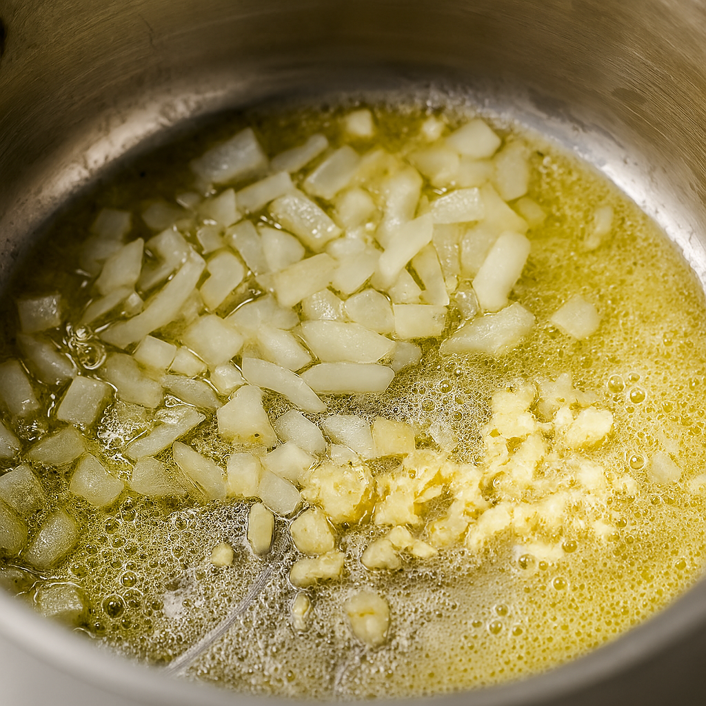 ◦ Add onion and garlic; cook until soft and fragrant.
