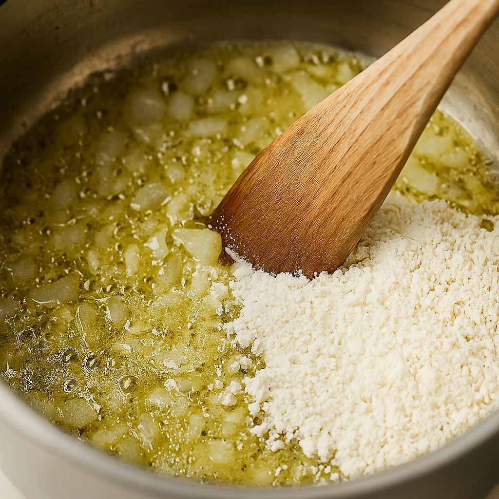 ◦ Stir in flour and cook for 1–2 minutes.