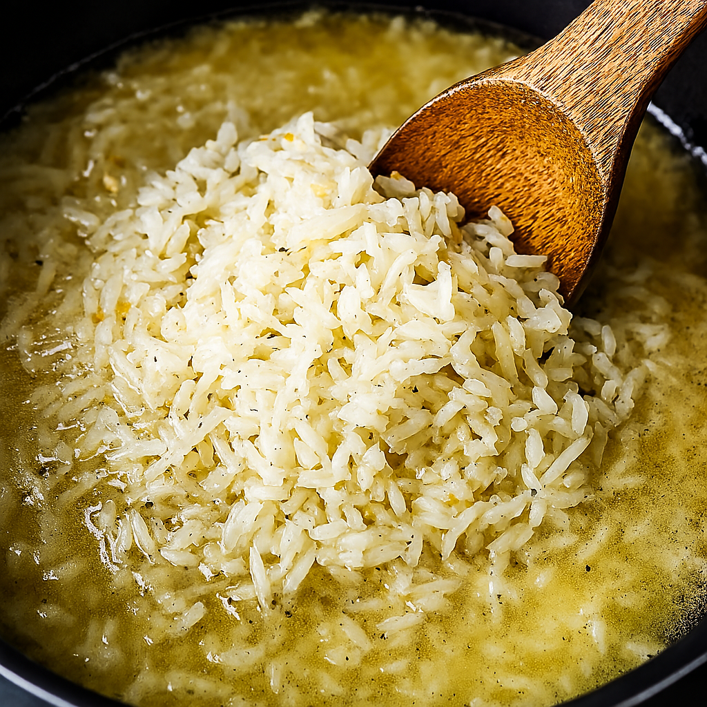 ◦ Add the rice and stir to coat each grain in the garlic butter.