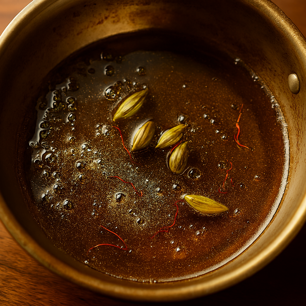 ◦ In a pan, combine sugar, water, cardamom, and saffron.