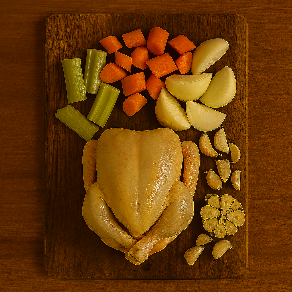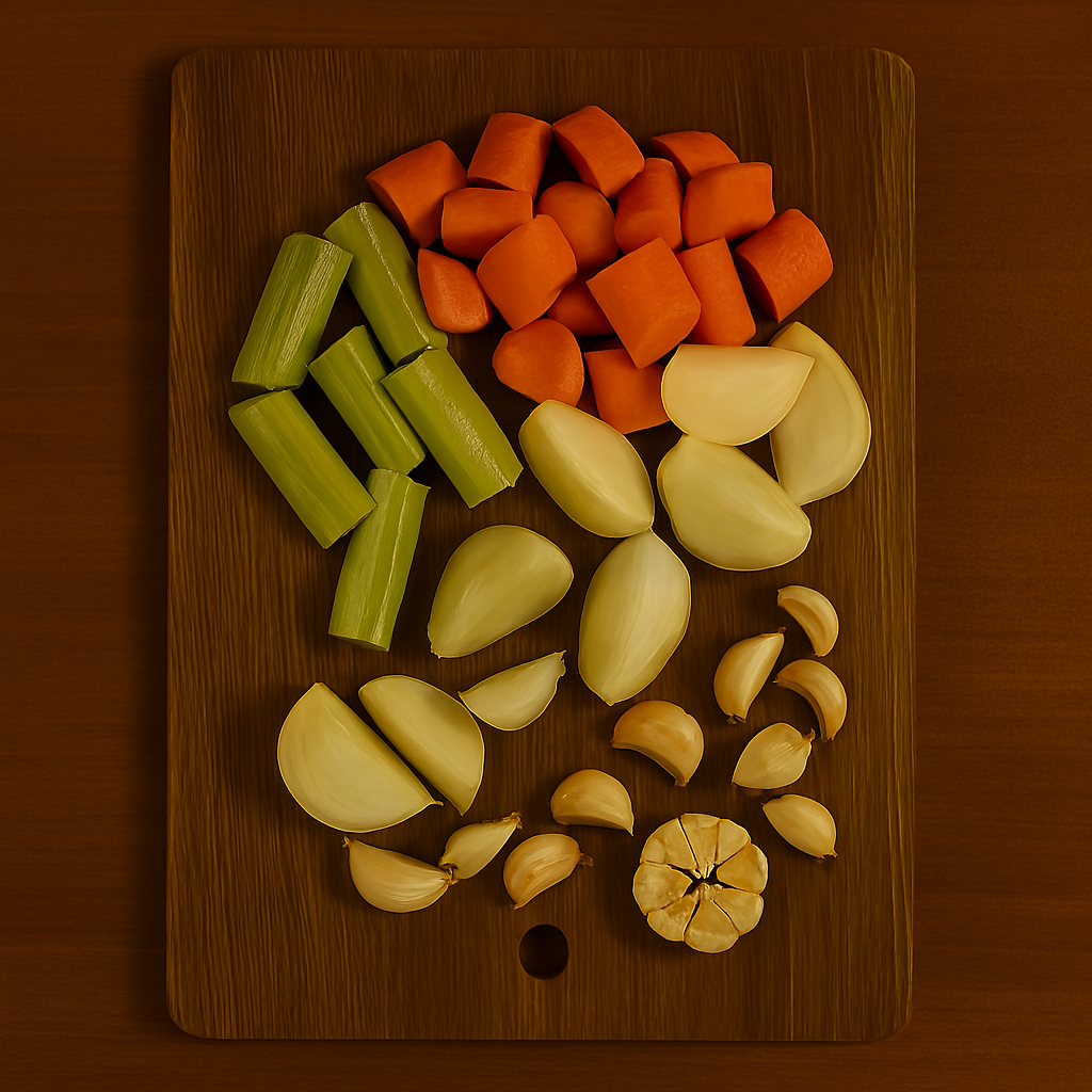 2. Roughly chop onions, carrots, and celery. Break garlic bulb into cloves (leave unpeeled).