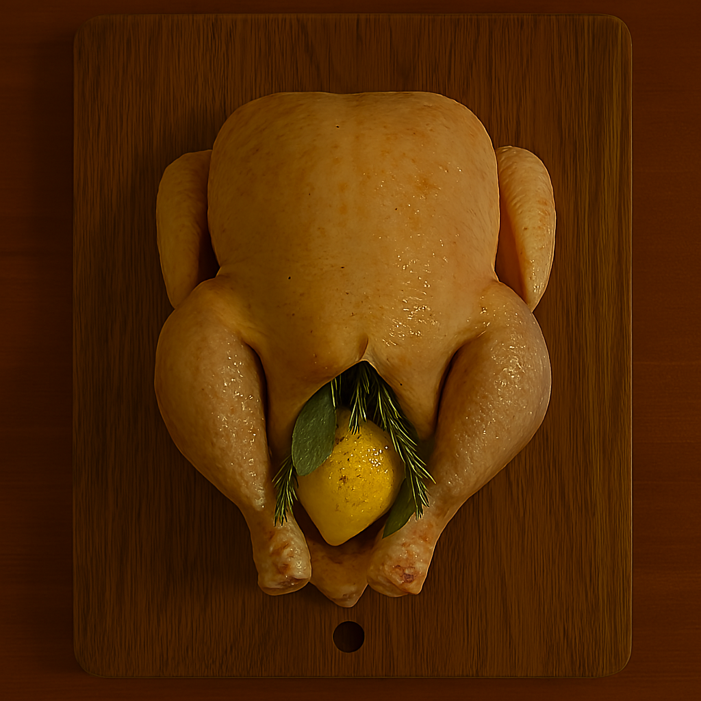 5. Prick lemon all over and place inside the chicken cavity with some herbs.
