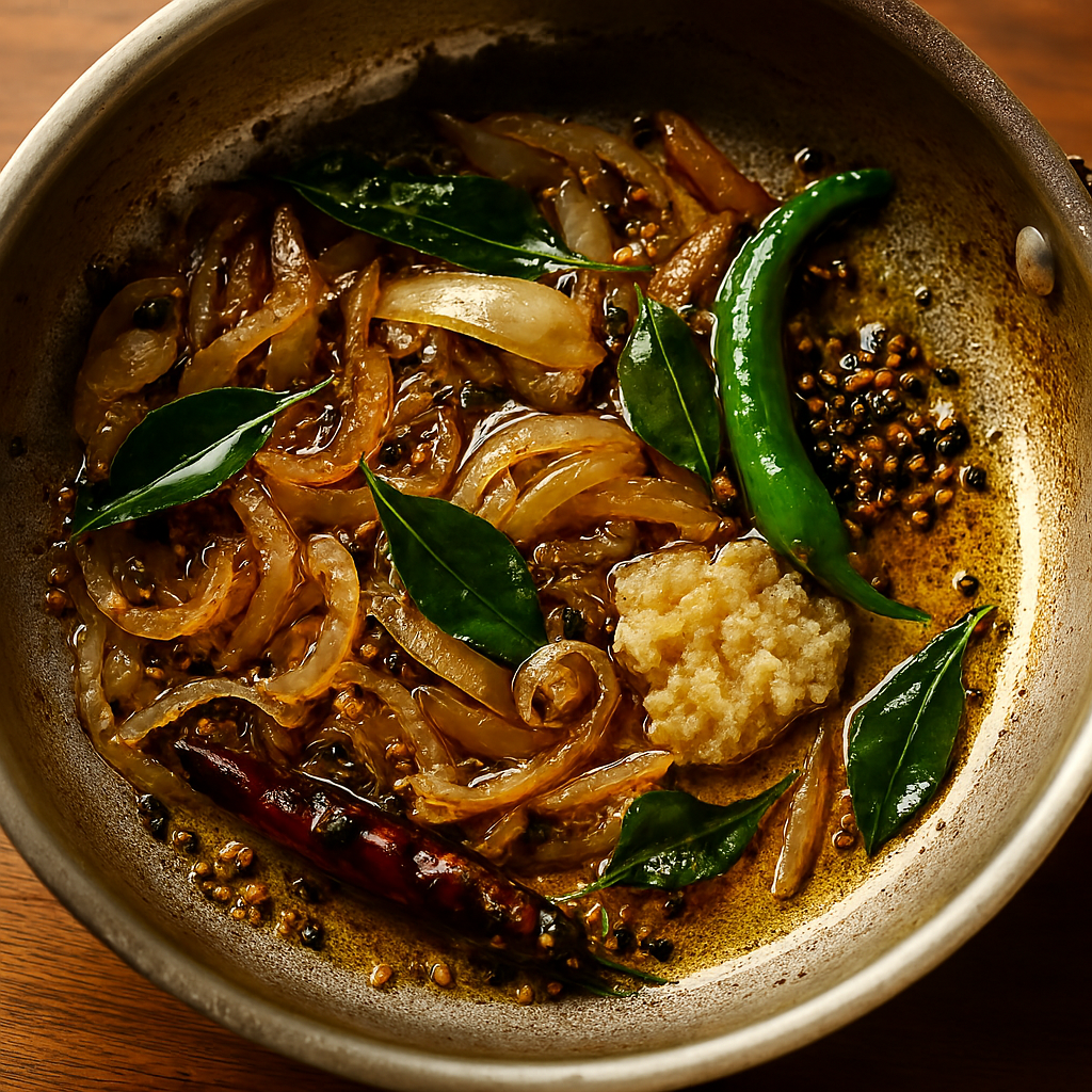 ◦ Add fenugreek seeds, curry leaves, and green chilies.