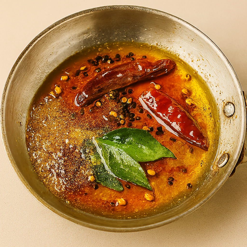 ◦ Heat oil/ghee, add mustard seeds, fenugreek, red chilies, hing, and curry leaves.